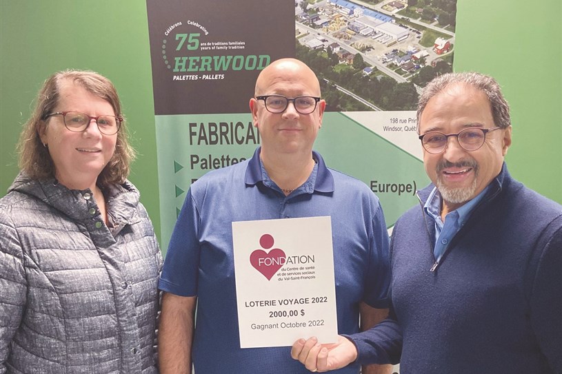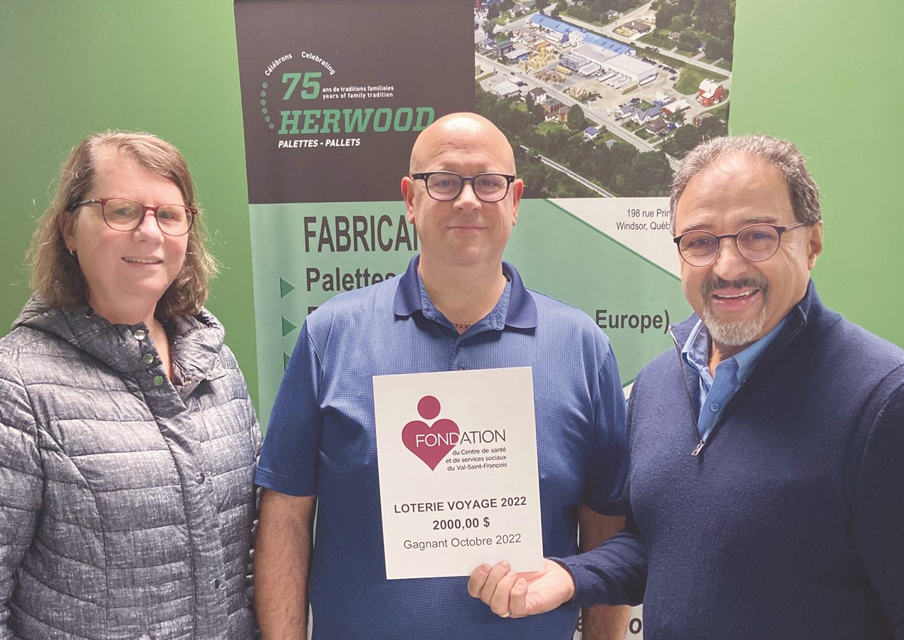 Windsor – La Fondation du CSSS du Val Saint-François a procédé dernièrement à son tirage Loterie-voyage du mois d’octobre 2022. C’est Jason Wheeler (au centre), PDG de la compagnie Herwood, qui a gagné le montant de 2000 $. Sur la photo, il est accompagné par Josiane Perron, qui a vendu le billet pour la Fondation, et par Denis Dion, président de la Fondation du CSSS du Val-Saint-François. M. Wheeler a décidé de remettre la totalité du montant, soit 1000 $ à la Fondation du CSSS et 1000 $ à Emmy Pruneau.