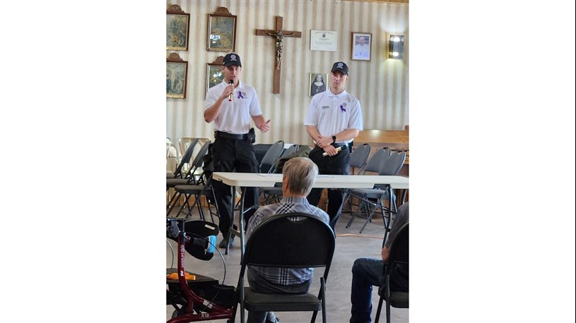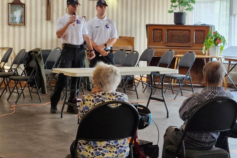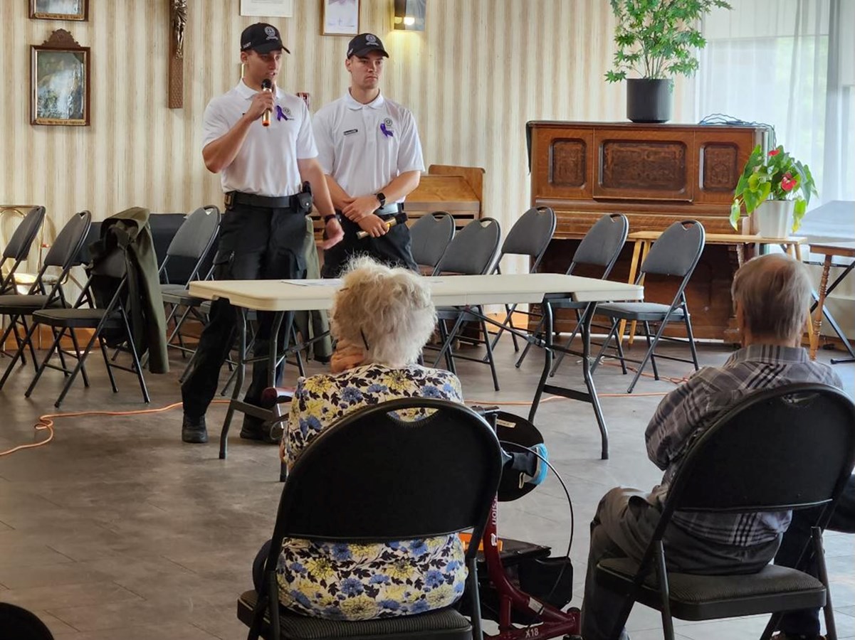 Accompagnés lors de leur visite par l’agente Leclaire, les cadets Roy et Desrochers-Pouliot ont donc pris le temps d’échanger avec l’audience présente, ainsi que de présenter des capsules de prévention en matière de sécurité et de fraude envers les ainées.