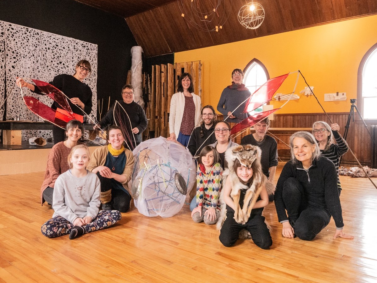 Les tableaux vivants, co-créés avec le groupe, s’ouvraient sur le rêve collectif servant à penser le lieu et son renouvellement d’aujourd’hui. L’éveil à cet imaginaire a pris la forme d’une libellule géante, que tous.tes étaient en mesure de manipuler.