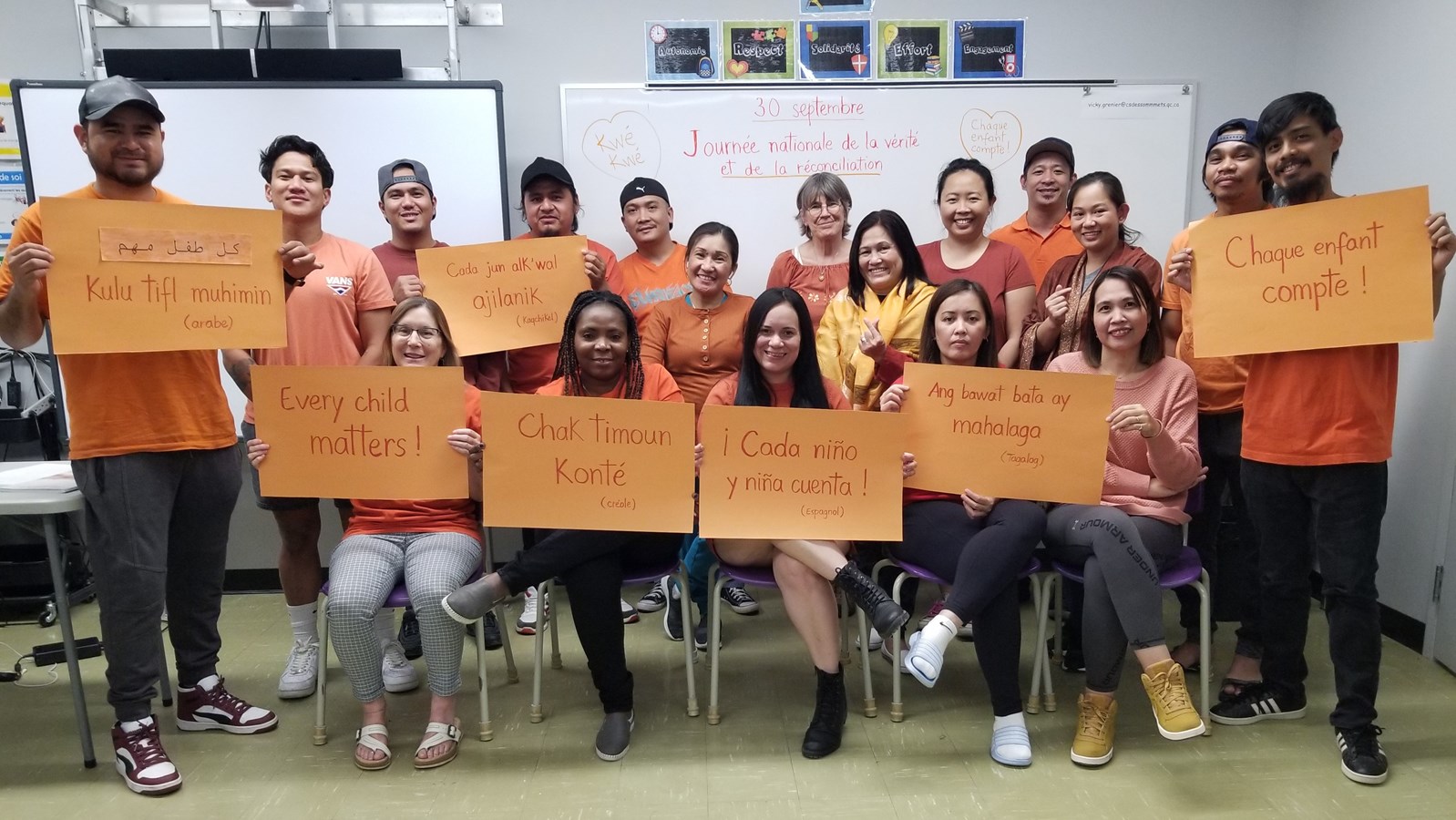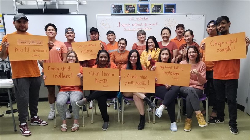 Richmond — À l’occasion de la Journée nationale de la vérité et de la réconciliation, qui s’est tenue le 30 septembre dernier, les membres du groupe de francisation de Richmond ont porté des chandails orange lors du cours du 28 septembre.