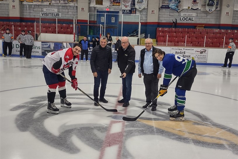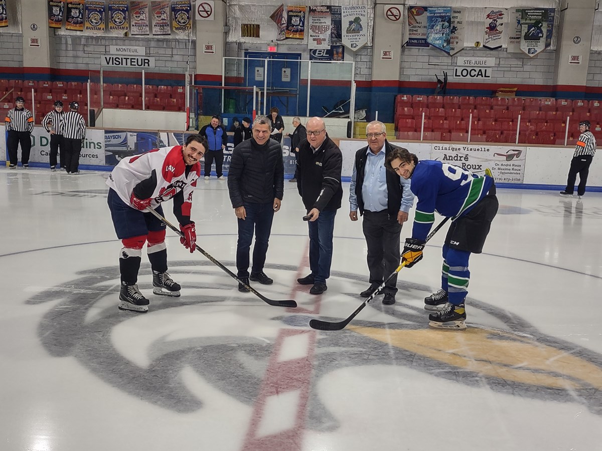 Mise au jeu protocolaire en présence du député de Richmond-Arthabaska, Alain Rayes, du maire de Val-des-Sources, Hugues Grimard et du président du tournoi Connie-Dion, Yves Côté.