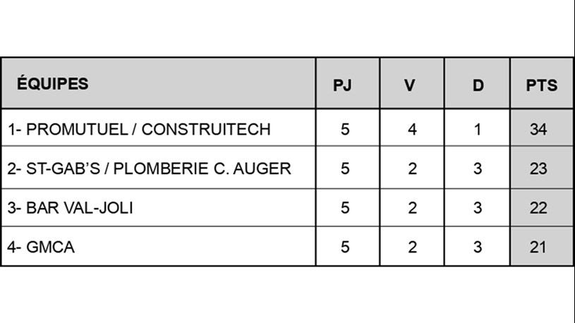 Le Promutuel/Construitech a quant à lui poursuivi sa série victorieuse de belle façon en prenant la mesure du Bar Val Joli au pointage de 8 à 3, lors du second affrontement de la soirée présenté au Centre J. A. Lemay de Windsor. Phil Dubois (3-1), Matthieu Corriveau (2-1) et Mike Boersen (1-1) auront particulièrement bien fait du côté des vainqueurs.